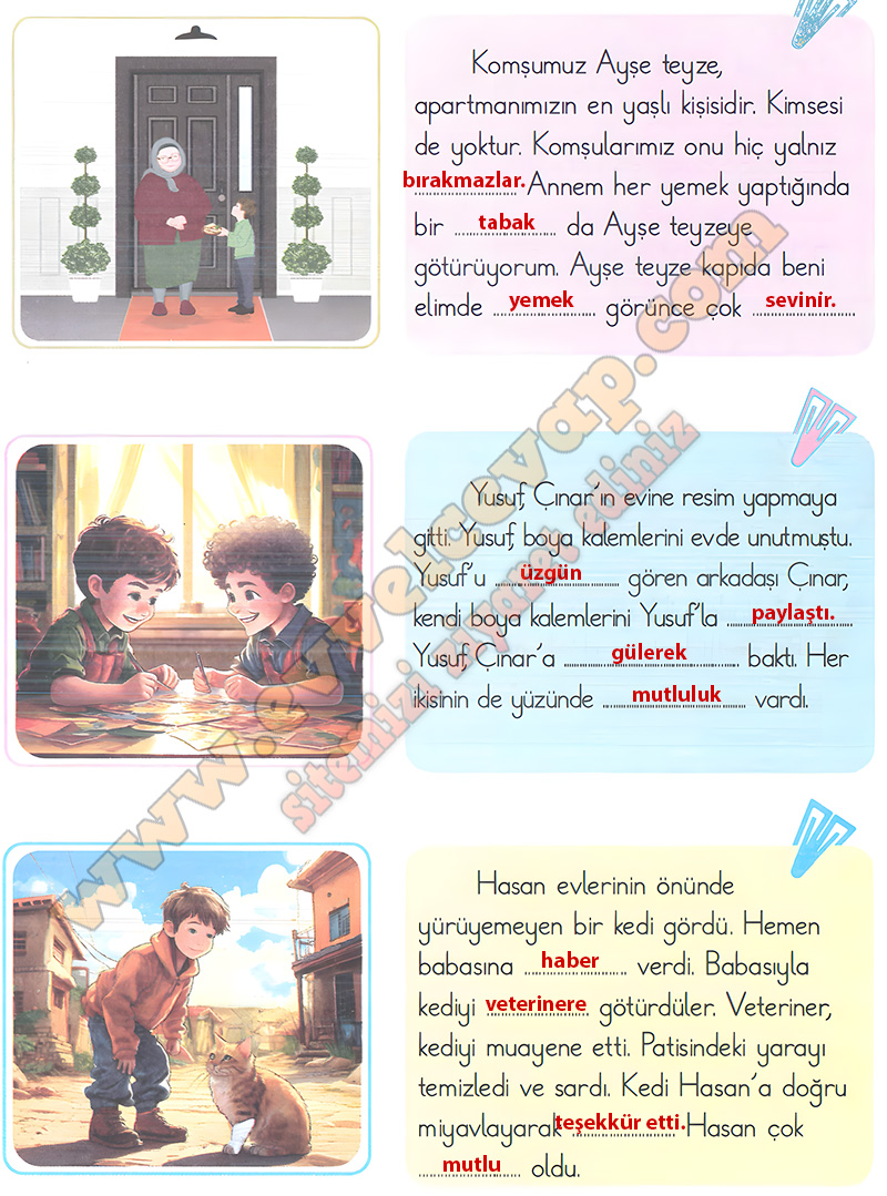 Soru: Metinlerde eksik bırakılan cümleleri görsellerden hareketle tamamlayınız.