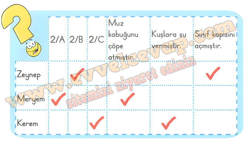Soru: Meryem, Zeynep ve Kerem farklı sınıflarda olan üç arkadaştır. û Her biri farklı bir iyilik yapmıştır. İpuçlarına göre tabloyu tamamlayarak kimin hangi iyiliği yaptığını bulunuz.