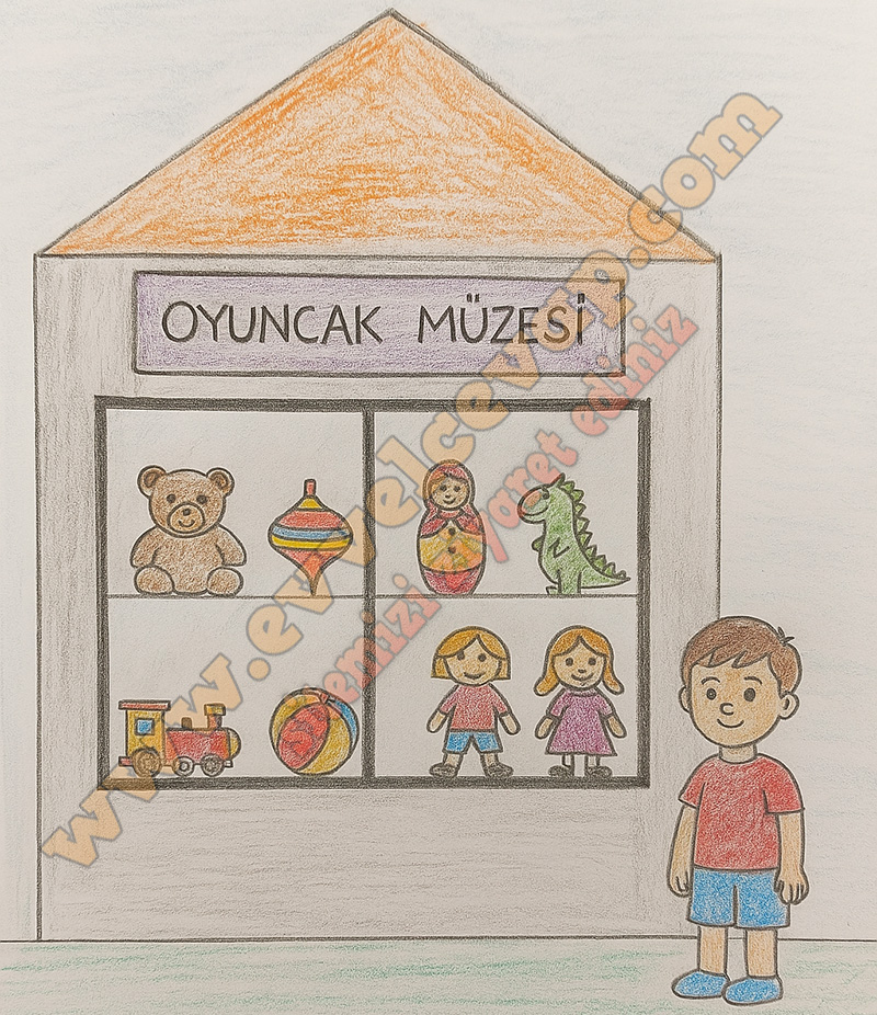 Soru: Bir müze tasarladığınızı ve bu müzede oyuncaklarınızı sergilediğinizi düşününüz. Tasarladığınız müzenin ve sergilediğini oyuncakların görselini çizip boyayınız.