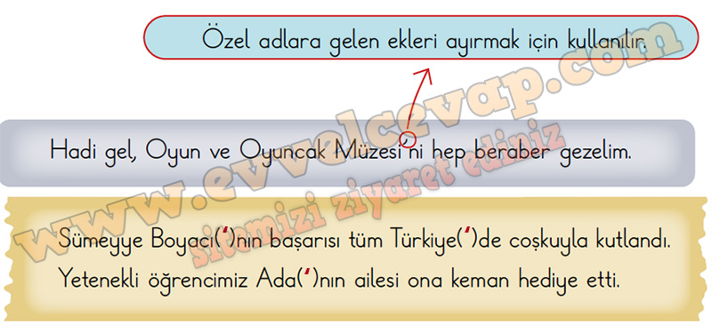 Soru: Cümleyi okuyunuz. Kesme işaretinin (‘) kullanıldığı yeri inceleyiniz. Cümlelerdeki uygun yerlere kesme işareti koyunuz.