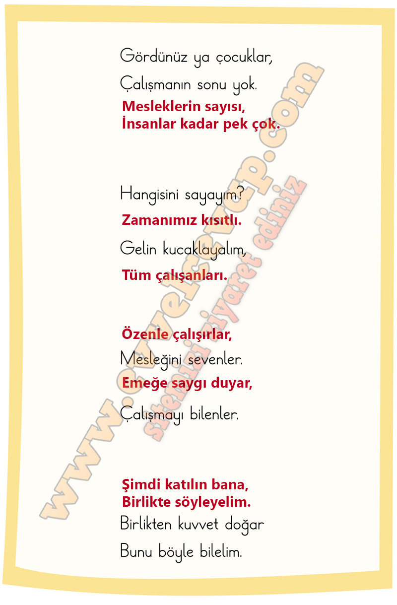 Cevap: Şiirde insanların farklı mesleklerde çalıştığı ve hepsinin önemli olduğu anlatılıyor. Çalışmanın değerli olduğu, emeğe saygı duyulması gerektiği vurgulanıyor.