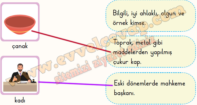 Soru: Görsellerden hareketle sözcüklerin anlamlarını tahmin edip sözlük anlamlarıyla eşleştiriniz. Sözcüklerin sözlük anlamlarını yazarak cümle içinde kullanınız.
