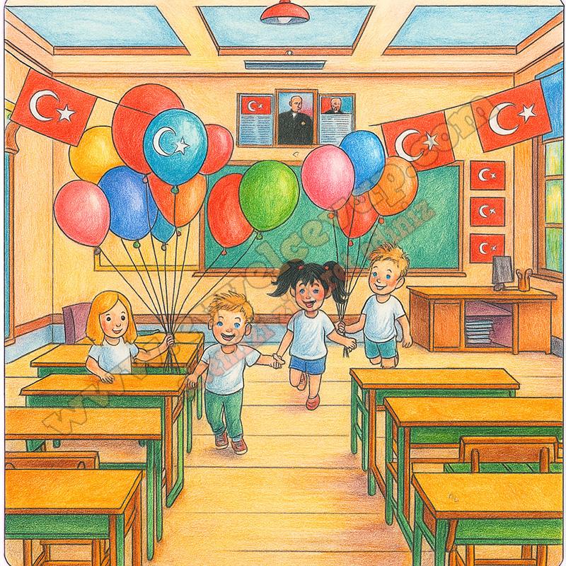 Cevap: Görselde sınıfta çocuklar balon ve bayraklarla kutlama yapıyor. Böyle etkinlikleri 23 Nisan, 29 Ekim ve 19 Mayıs gibi özel günlerde yapıyoruz.