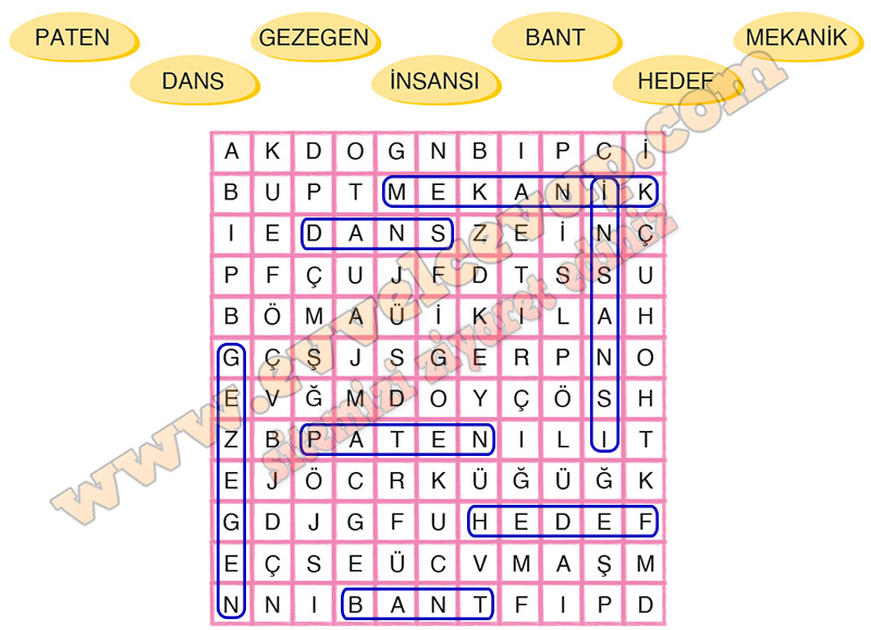 Soru: Metinden alınan aşağıdaki kelimelerin anlamlarını tahmin ediniz. Ardından bu kelimeleri bulmacada bulup işaretledikten sonra altta yer alan anlamlarının olduğu kutuculardaki noktalı yerlere yazınız. Anlamını öğrendiğiniz kelimeleri birer cümle içinde kullanınız.