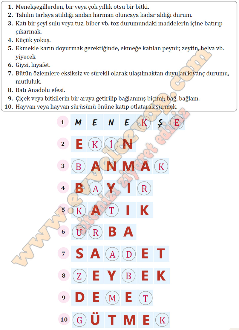 Soru: Metinde geçen ve aşağıda anlamları verilen kelimeleri, ipuçlarından yararlanarak bulunuz. Bulduğunuz kelimeleri bulmacaya örnekteki gibi yerleştiriniz.