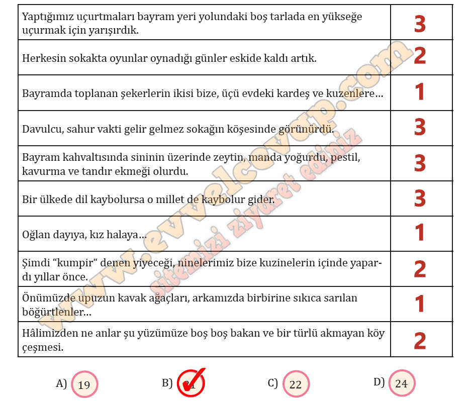 Soru: Esra’nın öğretmeni sınıfta cümle türleri konusunu işlemektedir. Öğretmen yüklemin yerine göre (öge dizilişine göre) cümleleri anlattıktan sonra aşağıdaki cümleleri tahtaya yazmıştır. Öğretmenin yazdığı kurallı her cümle 3 puan, devrik cümle 2 puan ve eksiltili cümle 1 puan değerindedir. Buna göre aşağıdaki cümlelerin hepsine doğru yanıt veren bir öğrenci bu etkinlikten toplam kaç puan alır?