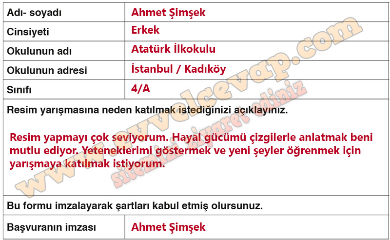 Soru: Resim yarışmasına katılmak için verilen aşağıdaki formu öğretmeniniz rehberliğinde, sizden istenilen bilgileri yazarak uygun şekilde doldurunuz.