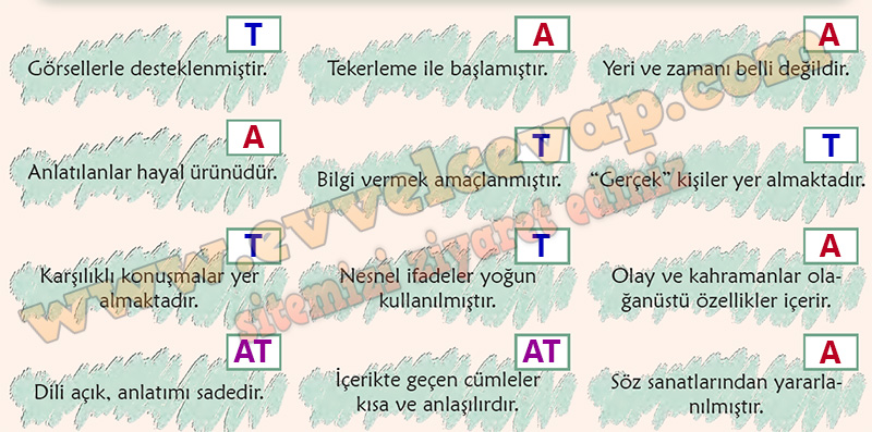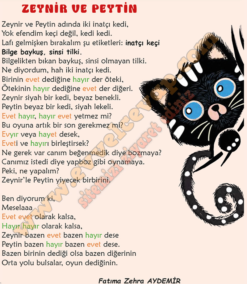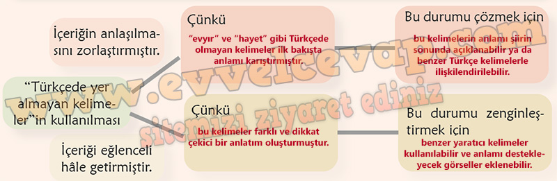 Cevap: Şiirde bazı hece ve kelimeler (örneğin “evet”, “hayır”, “evyır”, “hayet”) karşıt anlamlı oldukları ve şiirin ana fikrini vurguladıkları için farklı renklerle yazılmıştır. Bu kelimeler, Zeynir ve Peytin’in sürekli zıtlaştığını ve anlaşamadığını göstermektedir. Şiir sesli okunduğunda bu renkli kelimelere vurgu yaparak okumak, anlamı daha iyi kavramamızı ve dinleyenin dikkatini çekmemizi sağlar.
