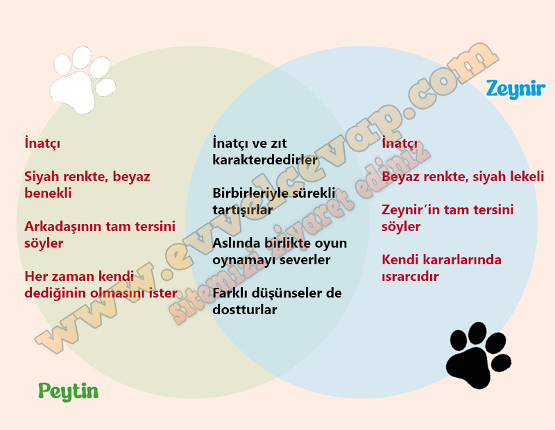 Cevap: Zeynir ve Peytin inatçı, farklı düşünen ve birbirine zıt davranan iki kedidir. Biri “evet” derken diğeri “hayır” demektedir. Her konuda birbirine karşı çıkmaları onların anlaşmasını zorlaştırmaktadır. Ancak her ikisi de aslında oyun oynamayı ve birlikte vakit geçirmeyi seven kedilerdir.