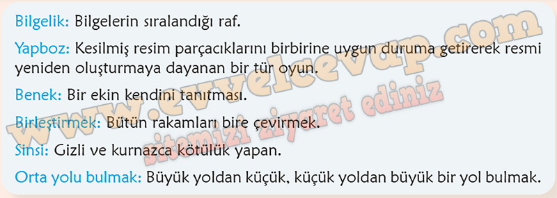 Soru: Şiirde geçen kelime/kelime gruplarından bazıları aşağıda tanımlanmıştır. Bu tanımlardan yanlış olanları belirleyiniz. Yanlış tanımlanmış kelime/kelime gruplarının anlamlarını metnin bağlamına uygun şekilde tahmin etmeye çalışınız. Tahminlerinizin doğruluğunu TDK. Güncel Türkçe Sözlük’ten kontrol ediniz.
