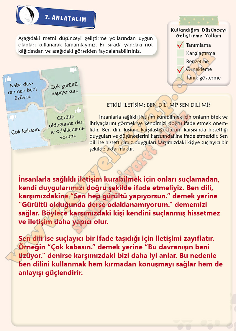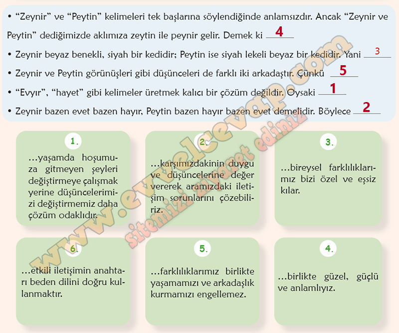 Soru: a) “Etkili iletişim kur…” ifadesini aşağıda oklarla gösterilen ifadelerin önüne sırayla getiriniz. Daha sonra anlamlı bir cümle oluşacak şekilde örnekteki gibi tamamlayınız. Her seferinde ifadeyi farklı şekilde tamamlamaya dikkat ediniz.