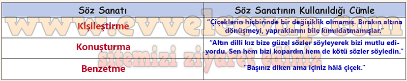 Soru: b) İçerikte kullanılan söz sanatlarını belirleyiniz. Bu söz sanatlarının geçtiği cümleleri ve söz sanatlarını aşağıya yazınız.