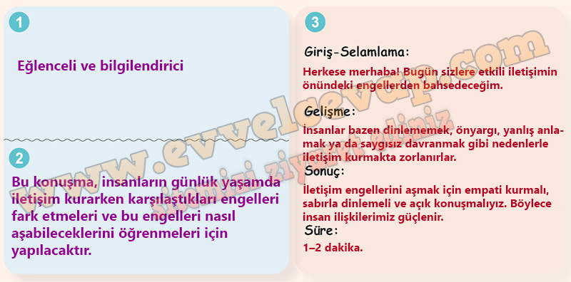 Soru: “GÖREVİMİZİ BİLELİM!” bölümünde yaptığınız “etkili iletişim önündeki engeller” konulu araştırmanızdan hareketle bir konuşma planlayınız. Konuşmanızı planlarken aşağıdaki adımları takip ediniz.