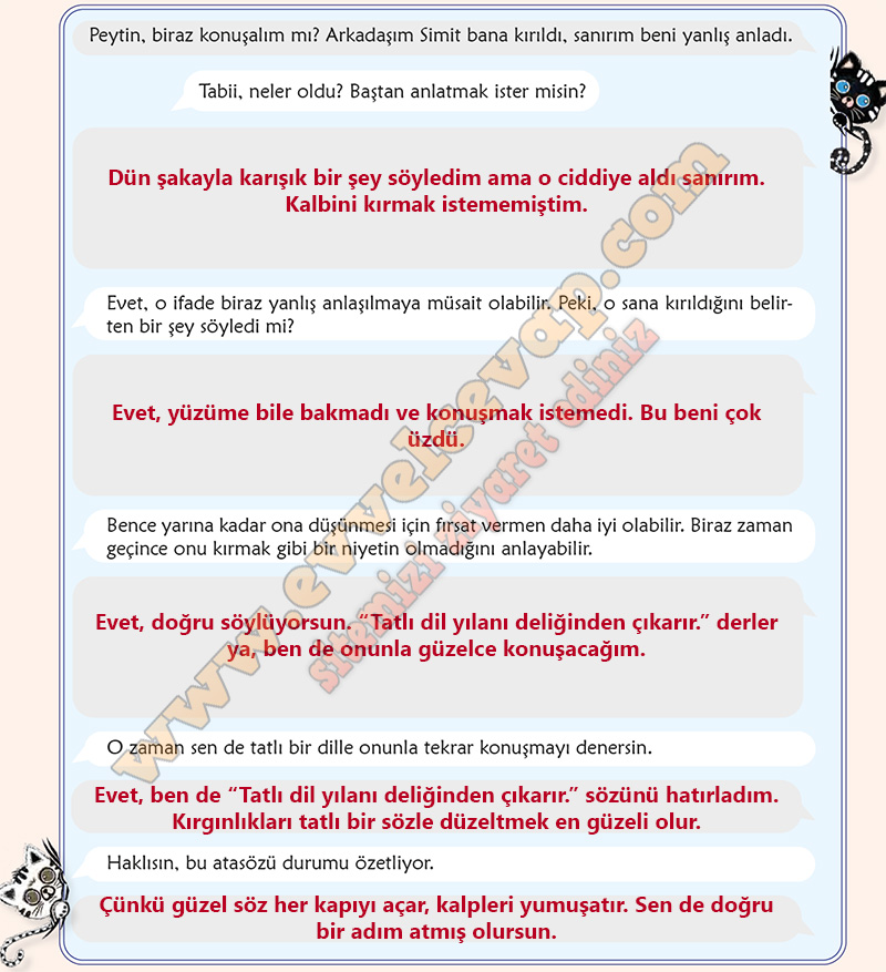 Soru: Zeynir ile Peytin arasında geçen aşağıdaki konuşmada boş bırakılan balonları uygun ifadeleri yazarak tamamlayınız. Bu sırada deneyimlerinizden ve ön bilgilerinizden hareketle açık ve anlaşılır ifadeler kullanmaya, örtük ifadelerinizi ise söz sanatları, mecazlar, deyimler, atasözleri vb. söz varlığı unsurları ile desteklemeye çalışınız.