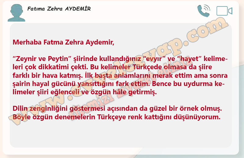 Soru: “4. ANLAYALIM” etkinliğinde ulaştığınız yargıyı düşününüz. Şiirde yer alan ancak Türkçede olmayan “evyır, hayet” gibi kelimeler hakkındaki düşüncenizi şairle paylaşmak üzere bir sosyal medya mesajı yazınız. Yazınızda uydurma kelimeler hakkındaki düşüncelerinizi net olarak ifade etmeye, bu kelimelere yönelik olumlu/olumsuz yargınızı yansıtmaya ve ulaştığınız yargıya yer vermeye özen gösteriniz.